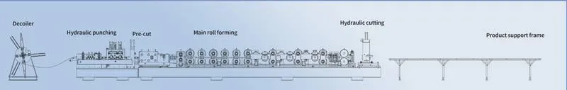 Mesin uncoiling → Membentuk mandrel → Sistem hidrolik → Sistem kontrol otomatis → Mekanisme pembentukan langkah demi langkah → Mekanisme geser otomatis → Meja penerimaan produk jadi. Proses inti meliputi pelubangan hidrolik dan pemotongan hidrolik.